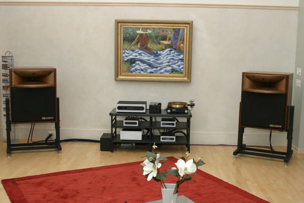 As expected, John's electronics are of his own creation. I found it interesting, though, that everything was new. In its past, Bel Canto created some well-regarded tube amps and preamps, some of which, I'm sure, would mate very well with John's speakers. But none was in use. Instead, John drove his speakers with a pair of e.One REF1000 monoblocks ($3990 per pair), which, according to our BHK Labs measurements, output almost 600 watts for 4-ohm loads and almost double that into the 8-ohm load of John's speakers. There was no preamp; instead, John was using a DAC3 digital-to-analog converter ($1995), which has a built-in analog-domain volume control. This received bits from a CD1 CD player ($4995) used as a transport. This configuration meant that John's vintage Micro-Seiki RX-1500 FG turntable with Fidelity Research stainless-steel tonearm and Decca London Jubilee cartridge were not in use. Speaker cables were Cardas Golden Presence in a shotgun configuration, while interconnects were Bel Canto's own. The power conditioner and power cords were from Shunyata Research, just what I was using at home. Even though John designs electronics, he beams when he talks about his TAD speakers. "The high-frequency impedance characteristic shows clearly that TAD horns do not suffer from the typical horn colorations caused by resonances from mouth reflection that show up as large ripples in the impedance response. There are a small series of very minor impedance ripples starting from the 300Hz resonance frequency of the driver and very little beyond until the first break-up mode of this 4" beryllium dome at around 18kHz (!) . Horn-hating audiophiles hear no issues with this horn system." "Horn-hating audiophiles" -- that's me! I can never accept the obvious wrongs of horn-loaded speakers in favor of the one thing -- dynamics -- they do very right. But John is correct -- his big TAD monitors don't sound horny. They display none of the colorations I hear in other horn speakers, including the megaphone-like directionality caused by the horn itself. As you can easily guess given the high power of the REF1000 amps and high sensitivity of the TAD speakers, John's system is blazingly dynamic. Shifts in volume large or small happen with astonishing speed. John's system also conveys space very well. I suspect that his room, with its lack of treatments, plays a role here. It's very lively, but the untreated surfaces are far enough from the speakers that reflections don't smear the music.