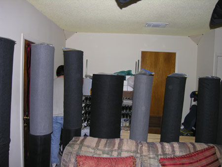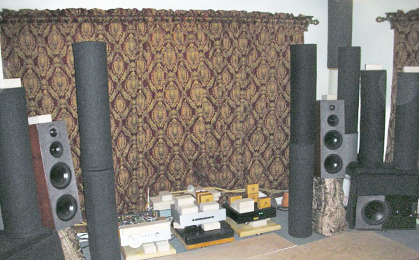 Many audiophiles use some sort of power-conditioning device to provide clean power to their systems, but the Austin trio felt that commercial products didnt go nearly far enough. They started at the power meter, running three 85' lengths of 00 AWG wire to a distribution box with five magnetic/hydraulic circuit breakers. These are better than typical circuit breakers, which depend on heating up to break the circuit. From there, five double runs of 10 AWG wire route the power to a box behind the house, which holds five SOLA 2kVA constant-voltage transformers. Why five? Well there are five components: integrated amp, DAC, CD player and two powered subwoofers, each of which gets its own isolation transformer. These transformers are massive, making most audiophile power conditioners look like toys. From the transformers, the power is conducted into the listening room via five 15' runs of single 10 AWG wire, which Stan has meticulously wound. Inside the listening room, five SK Research Audio non-current-limiting AC line filters are used to filter out any residual power anomalies. Needless to say, this fanatical approach to power conditioning assures that each component has a virtually unlimited supply of the purest power possible. Room treatments When you enter the listening room, you have to negotiate a forest of homemade sound columns -- 49 of them to be exact. These tube traps are placed on the side walls and back wall -- everywhere except between the speakers. Well, there are a couple there too. Not satisfied with commercial tube traps, Dave, Ralph and Stan elected to build their own, which afforded better tuning options. Their tube traps come in various sizes: 33 are 6" in diameter by 3' high; eight are 11" in diameter by 3' high; six are 16" in diameter by 3' high; and two are 6" in diameter by 14" high. Heavy wool curtains damp the walls. Even the blades of the ceiling fan are damped -- four down pillows are strapped to them. Lots of felt padding is used, including pieces cut to fit on the front panel of the Aerial LR-5 speakers to damp reflections from the speaker cabinet. Ten yards of muslin cotton on the floor damp reflections from that surface. Vibration control The treatments described so far assure power problems and room acoustics are addressed. The Austin trio also addressed vibration control. One of the first items that caught my eye was the Thorp Audio Group (TAG) stainless-steel cones under several components. Made by Ralph from one of the hardest alloys of stainless steel, these massive cones weigh in at four pounds each. Two sets of TAG Classic cones and 28 sets of TAG 1 cones are used throughout the system -- each set consists of three cones. The points of these cones are quite sharp, to couple vibration into the underlying surface. Interested? Check out Ralphs website: www.thorpaudiogroup.com. What also caught my eye were the many SK Research Audio laminated wood damping blocks that Stan contributed to the system. The SK blocks go under, on top of, and beside components to damp vibration that would color the sound. Other SK Research Audio products included a device that damped vibration in the front panel of the amplifier, and a doughnut-shaped device that fit over the volume knob and damped vibration there. Unlike many vibration-damping devices, the SK Research products are tunable, so you can match them to specific components. Their purpose is to damp musically harmful vibrations in a component without damaging musical information -- a tall order. About his products, Stan says: