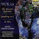 All kidding aside, even if he wasnt quite a one-hit wonder on the surface, it seems that Dukas wasnt a very prolific composer either. When you mention Dukas, the piece lifted by Disney is likely all that comes to mind. This is not helped by the fact that not many of his other works survive -- he destroyed all his unpublished compositions shortly before his death and left behind only a fragment of his lifes oeuvre. One opera, one ballet, a few tone poems, some piano works, and few other chamber pieces are all that remain. Two of his best orchestral compositions appear on this CD, but also included is his infamous symphonic poem. One is surely familiar (tired of?) The Sorcerers Apprentice, but I guess it has been included if only to induce the newcomer into purchasing the CD. This piece is a double-edged sword -- for if it werent for this "joke," as Dukas once described it, his other works may have never been performed other than during his lifetime. This CD is evidence M. Dukas was far a better composer than this small-scale work suggests. The CD starts out with the its brief Fanfare, then the complete ballet score to La Peri. This is Dukas last published work and my favorite track on the CD. It is a fine impressionistic/romantic amalgam, a bit more French than European, but with many elements that are recognizable to both schools. To be perfectly honest, at first listen it was tough for me to listen to this music without wondering what could have become of it if Dukas were just a bit more adventurous with his orchestration (or if Dukas were high(er) on absinthe). After a few listenings I came to appreciate it more. It holds up remarkably well next to work of the other more famous French composers of the turn of the century -- even if it is not nearly as modern (or as absorbing) as compositions by Dukas' friend Claude Debussy. Next up is The Sorcerers Apprentice, which I only listened to the first few minutes of before moving on to the next track. OK, you might be disappointed in me for not listening to this CD en toto, but I just couldnt bear it. Closing the CD is his three-movement Symphony in C. The version Im most familiar with is from an LP with the London Philharmonic conducted by Walter Weller [London CS6995, also available as Decca SXL SXL6770 ]. Im often accused of preferring versions on vinyl just in principle, but there is not much to back up that argument here. The Cincinnati SO responds wonderfully to Lopez-Cobos -- the Symphony is both played and conducted just as convincingly, perhaps more so. In addition, the engineers from Telarc should also be commended; it is partly because of them that this CD spent longer in my player than for just the review period. All the sections of the orchestra can be clearly heard without ever sounding too detailed, and the soloists are never unnaturally highlighted. This contributes to the very listenable, non-fatiguing sound throughout the entire program. The frequency extremes are first rate -- the bass is weighty without exaggeration, and highs are natural. Still, the sound quality is not quite as good as it is on Lopez-Cobos version of Mahlers Ninth Symphony [Telarc CD 80426] (which if you havent acquired by now, shame on you). There is a magnificence to the Mahler recording that places it all but in a class by itself. But I digress. I dont think I would go as far as to give this CD an unconditional recommendation. But by now there are likely music lovers who have grown tired of the umpteenth release of works from the standard repertory, and others who might not be able to (or even want to) understand fully the more adventurous twentieth-century inventions. To either, this CD might be a welcome addition. GO BACK TO: |