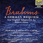 Brahms German Requiem was the first work to win him international acclaim -- and for good reason. It is a fantastic piece of music, regardless of lyrical content, and the lyrical content is what I think attracts many to it. Rather than a traditional Latin requiem mass, its German text is taken entirely from the Bible -- its content was chosen entirely by Brahms. But I like it more for its orchestral score, which is spiritual, haunting, and melodically powerful. I have two versions that I listen to within my collection, one on LP and one on CD. The LP is the EMI boxed set of the Philadelphia Orchestra conducted by Otto Klemperer [EMI SLS 821, also available on CD on EMI Classics 66955]. It was a while before I bothered to find a decent version on CD, but then I finally picked up the version with the Atlanta Symphony Orchestra and Chorus conducted by Robert Shaw on Telarc [80092]. Its a barn-burner. If youre at all curious about this work, and especially if youve had your doubts about Brahms, I implore you to check out this CD. Its a shame that Mr. Shaw didnt live to record the English translation of this Requiem, which was his labor of love for such a long time. In fact, he wrestled with whether or not to even try to perform it in English because of the "inappropriateness" of the language, namely, how it would musically "fit" into the score. He struggled with different translations of the German and believed up until the rehearsals for the recording that this is no sense a "translation" of the text, but rather an adaptation of the King James version of the scriptures to the music. Unfortunately, Robert Shaw died less than three weeks before this CD was to be recorded. The associate director of the Mormon Tabernacle Choir at the time, Craig Jessop, took Shaws place for the recording. Jessop worked with Mr. Shaw many times and was preparing the Choir for this performance at the time of Shaw's death. I think this review would be much too long if I continued to explain the motivations and complexities behind the recording's creation. Also, as a listener, it hardly matters as much as to the circumstances behind the recording when Im sitting in my listening seat spinning the CD. What Im interested in, as I assume you are, is whether this CD is worth listening to more than once -- that is, whether it will transcend the mere novelty of a German work sung in English. One of my first reactions to this CD was that the Utah Symphony has certainly come a long way. My apologies to all Utah natives who may be skewed by their home-field advantage, but the Utah has never struck me as more than a passable second (or third?) tier orchestra. On this CD they sound as if they are playing for keeps, and if it is just because they were well rehearsed, so be it. The results speak for themselves, and they certainly are in top form. However, it was more than a bit disconcerting to hear the chorus recorded so loudly -- but I soon realized that this may be because the Mormon Tabernacle Choir is 325 members strong. The wall-of-sound produced by the throng of voices is very moving, and the MTCs singing is without question quite impressive. To consider that one rarely has to refer to the libretto to decipher the text is quite a feat. Their diction, regardless of whether it is in an easily recognizable language, does not come across as forced. Much like the orchestra, they sound more than well rehearsed and noticeably enthusiastic with reference to the score. Part of the enjoyment of listening to this piece is in the sheer exuberance that the chorus, orchestra, and soloist bring to the work. However, when switching back to my "reference" versions of this work, this recording falls a little short. Granted, if you want to hear a version in English, this is it. But aside from the uniqueness of the language and the mighty chorus, this is certainly not an "ideal" version of the German Requiem. First of all, as much as I initially enjoyed being sonically flooded by the large forces of the MTC, it more often overpowers the orchestra. They also seem to have trouble with dynamics, especially the pianissimo sections. The orchestra also has some rough spots, as far as dynamics are concerned. One can hardly blame them, but throughout the piece the orchestra seems to have a tough time balancing their sound with the chorus. Tempo is also an issue, and Im sure some will find fault with Jessops pacing, which seems a bit rushed in places and a bit slow in others. But still, overall he seems right on, especially in the all-important second movement where the text comes through ("Behold, all the flesh is as the grass"). One cannot help but be moved by these words combined with the awesome sounds emanating from the orchestra. Even though I realized that using this large of a chorus probably caused the problem, Im not sure if I should just blame the chorus for overshadowing the orchestra. Most likely it was a multi-tracked recording, and it could have easily been fixed during mix-down. Since I dont have a home-theater setup, Im hardly the person to speculate, but its possible that this CD would sound awesome in surround sound, and then all of my complaints about the chorus being too loud might be moot. On my system, the chorus seems like it was placed in front of the orchestra. How did this happen? First, Jessop is a choral conductor, and he might have emphasized the voices, intentionally or not. Second, I could blame the chorus; 325 voices is quite a mob, and they could hardly help themselves. Last, it might have been the Telarc engineers who chose to highlight the chorus. I think others, especially those with a more scholarly knowledge of Brahms, might have problems with the English translation, but I certainly didnt. Shaw did a fine job at matching the German meter, though Im sure the academic world will analyze this version to death. Not only will they find problems with the meter, but also with the "translation." As a music lover, I fin