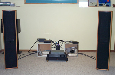 The first system I saw was the one in the longer, narrower room that you enter when you first come down the stairs to his basement -- the room that doubles as his office. This system usually has the Merlin TSM-SE loudspeakers in it, but on the day I visited, Marc had the big Mirage OM-5 loudspeakers he just finished reviewing set up. Of the two systems he has in his house, this is the less-expensive one -- although it still costs more than most people would consider reasonable. A budget guy Marc is really not. The rest of this system consists of the Audio