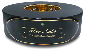 While it isnt necessary to mortgage your house to procure a quality phono preamplifier, it is necessary to consider that the final sound will be totally dependent on the weakest link in the chain. When the phono stage is the weakest link, no amount of money spent upstream will correct its faults. When the Thor TA-3000 phono stage arrived at my house, I was most interested to hear if it was going to be a strong link for me. Description Thor Audio's $6990 USD TA-3000 is a two-piece phono preamplifier, with one chassis containing the primary signal-path electronics and the other containing the power-supply components. The main unit is toroidal in shape, which is the traditional chassis trademark of Thor Audio. Whether this departure from the rectangular "black box" approach appeals to you (or not) will be strictly a matter of personal preference. Thors use of this shape was not primarily motivated by a desire to be different, but rather for its resonance-reducing and short-signal-path advantages. I personally found the appearance of the TA-3000 to be unique, attractive, and a very nice departure from the norm. The main unit measures 14" in basic circumference, and approximately 5" tall. In the center of this large toroid is an open area that contains the tubes. In the review sample, this opening was lined with high-gloss gold-plated metal (yes, real gold), but chrome is also available. Very classy-looking, to say the least. A removable cover (gold or chrome plated, depending on the interior metal finish) is provided to go over the opening in the event RFI poses a problem. I had no such problems during my time with the TA-3000, so I didnt use the cover. Besides, I like the look of naked tubes. The factory feet deserve special mention, as they all consist of a Black Diamond Racing Cone coupled to a BDR Round Thing. Its not often that you see such expense and attention placed on the footings of a component, but it shows how important Thor considers them to be. The tube complement consists of four 12AX7s and two 12AT7s, all Russian sourced. On the front of the chassis reside two long-handle toggle switches, one for play/mute and the other for stereo/mono. (Ill say it again here: I wish every phono stage had a mono switch, as it is necessary for optimum playback of mono recordings, as well as being a nice tool for cartridge setup). Finishing out the front is an LED mounted close to the top center, which indicates positioning of the play/mute switch. Around back are four gold-plated single-ended RCA jacks (one pair for input, the other for output), and the umbilical connector for the power supply.