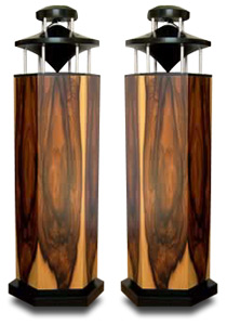 The Venus measures a tad over 3’ tall and is in three sections. Starting at the bottom, there is first the six-sided (to reduce internal standing waves) rear-ported bass enclosure, at the top of which is an 8" carbon-fiber woofer. The woofer fires up into a flying-saucer-shaped sound radiator of beautifully finished wood; this disperses the sound evenly over 360 degrees. The radiator is suspended on six narrow, cylindrical metal posts above the woofer, and sits closer to, but still a distance from, the soft-dome tweeter, which is connected to the radiator by another six posts and fires down into the radiator. The radiator is shaped slightly differently on top and bottom to reflect the differences in the soundwaves from woofer and tweeter. The Venus’s impedance is listed as 4 ohms, its sensitivity as 88dB. Each speaker has a single pair of binding posts. Plastic they may be, but I found them a joy to use, with no apparent adverse sonic consequences. The speaker has rubber feet.