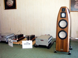 During my stop at VMAX Services room, proprietor Richard Kohlruss showed me two systems that provided excellent performance at reasonable prices. The first system used a Unison Research integrated amp, the new 140Wpc Unico SE ($2599 including MC/MM phono board) that uses a hybrid circuit with a tubed front-end with solid-state output. A Unico CD player ($1999) was the music source for the system, and has the unusual feature of providing a digital input as well as digital and line-level balanced and unbalanced outputs. But the star of the system was the amazing SuperPavarotti speaker from Opera. The elegant solid-hardwood enclosures are tiny: 5 1/2" wide by 8 1/2" deep by 40" tall. A 2.5-way system with only 4 1/3" midrange/bass drivers, the SuperPavarotti produced a hugely dynamic presentation with deep bass that had me searching for a hidden subwoofer (which didnt exist). Although its specifications say bass extends to only 50Hz, in the demonstration room, the SuperPavarotti sounded as though it was reaching the upper-30Hz range. And if you want more bass, Opera offers several subwoofers. VMAXs other high-value system was based on Audio Analogue electronics and Triangle speakers. Audio Analogues Paganini CD player ($1899) was the source, while the latest iteration of Audio Analogue's Puccini integrated amplifier ($1899 with phono section) provided power. Triangle Antal ES speakers ($1999/pair) generated lively, very dynamic, articulate sound with surprisingly deep bass. With a 91dB efficiency, the Antal ES speakers were completely comfortable with the 70Wpc output of the Puccini integrated amp. Glorious sound at a reasonable price!