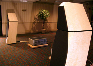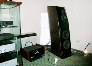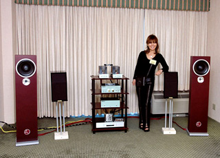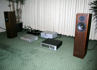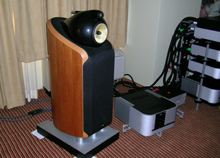 In the other ListenUp room, B&Ws $20,000-per-pair 800D speakers were driven by an impressive array of Classé Audio equipment: a $6500 CDP-300 universal player, a $7000 CP-700 preamp, and $5000-each CA-M400 400W mono amplifiers. An assortment of AudioQuest cables connected the components and speakers, while a $2000 Shunyata Hydra Model-8 power conditioner and $1000 Shunyata Python power cords provided necessary power. When Eva Cassidys "Fields of Gold" was played, the sound was clear, clean, and direct. It revealed that the original recording was not audiophile-grade, but that didnt stop it from sounding very moving. Art Audio demonstrated its usual assortment of gleaming tube beauties, using a $7500 Einstein CD player to drive the $4500 Gill Alana line-stage preamp, which in turn drove the $7500 Carissa Signature SET amplifier (with remote volume control). Speakers were the remarkable $995-each Cabasse Riva monitors; a pair of $1995-each Cabasse Largo subwoofers shook the room with clean, well-integrated bass. Crystal Cable's CrystalSpeak speaker cables and CrystalConnect interconnects tethered everything to produce a powerful, clear, dynamic sound that connected you directly to the music. This system would be a good fit for an average-sized room. Dealer Alpen Audio showed a spectacular system with $20,990-per-pair Avantgarde Duo 2.2 speakers and Thor electronics -- a $9990 TA-1000 preamp, $10,990-per-pair TPA-30 Mk II amps, and a now-discontinued DC-1000 DAC. A $7950 Oracle CD-2000 CD turntable spun CDs. The equipment was supported by a $3999 Grand Prix Audio Monaco four-shelf audio rack, while the amps rested on $900 Black Diamond Racing BDR-1 stands. As youd expect from a large horn system, the sound was lightning-quick, very detailed, and produced a good soundstage.