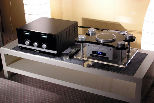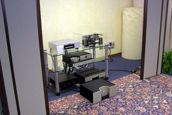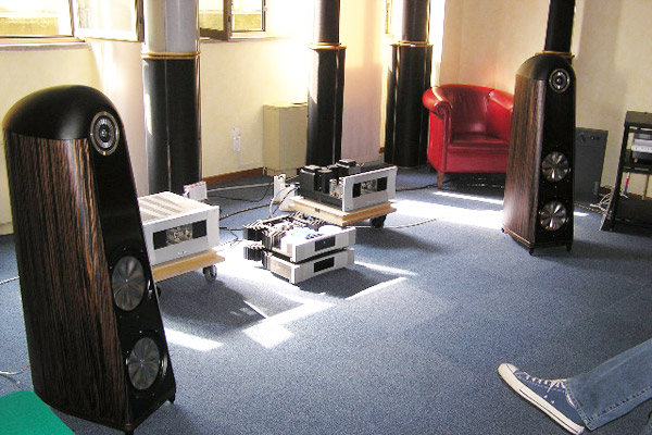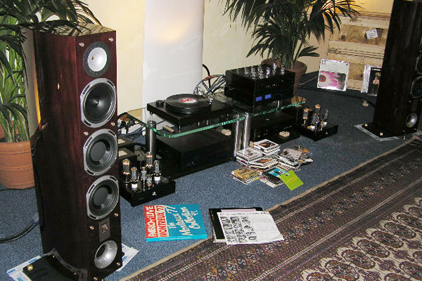 My final stop at Top Audio was just across the hall, where Viva was sharing a room with Amphion speakers. As confessed above, I have a weakness for designs that present wondrous mysteries to me, and Viva does that. Amedeo Schembri, Vivas designer, explained that he preferred the most simple solutions to the complex engineering problems posed by high-end audio design. "I want the linearity of the modern," he said, "but with the warmth and -- how you say? -- the realism of the amplifiers from the past." His system consisted of the Viva Solista LT integrated amp (17Wpc, 7400), and, making its European debut, the neat and nimble Amphion Prio 520 loudspeaker with side-firing woofer (87dB, 8 ohm, three-way, 2290). The source was the three-box Paganini from dCS: CD transport, DAC, and word clock (30,000). Silent were the Amphion Xenon speakers (three-way, 4100/pair). The sound on orchestral works by Stravinsky and Wagner was clean, balanced, and natural, with great depth. I always love the sound of dCS digital equipment -- so precise and focused, without being edgy or etched; so clean and tonally accurate -- and here it was given weight and body by the Viva amplification: in all, a lovely synergy throughout. I came away thinking this would be a perfect system for a small listening room in the suburbs or an apartment in Milan -- or Portland, Oregon for that matter. ...Garrett Hongo