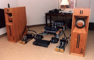 Venerable distributor Tri-Cell Enterprises, from Toronto, fielded two rooms at the show. A rack-full of eye-candy from the popular Synthesis of Italy was on display, as well as a pair of Oskar Heil Kithara loudspeakers in full black-lacquer regalia. The naturalness of the mids and highs generated by the special Oskar Heil "washboard" electromagnetic driver is worth hearing. Both the sound and the driver itself are totally unlike any other speaker technology I am aware of. The visually and sonically stunning Acapella Violon speakers dominated Tri-Cells big room. Though they are the smallest of their line, they are still massive, standing nearly six feet tall. The design is a three-way, featuring an acoustic-suspension woofer, a top-mounted front-facing horn-loaded midrange, and a central ion tweeter. The latter uses a continuous high-voltage corona discharge to generate a plasma flame, which vibrates the air by changing in volume according to the musical signal. The plasma flame is nearly spherical and considered essentially massless, allowing excellent dispersion characteristics with near-perfect tracking of the high frequencies. Perhaps coolest of all, the plasma flames are visible in the throats of the brass tweeter horns when in use. If you plan to rush out and buy a pair of Violons, youd better check with the bank first. They retail at approximately $29,000 USD. Driven by the Accustic Arts Drive I CD transport, a Hovland tube preamp, and the new solid-state Hovland power amp with Shunyata cabling, the speakers provoked effusive comments from the SoundStage! team. "That tweeter sounds like nothing!" gushed Doug Schneider. Indeed, there was a startling realism in the high frequencies, a unique kind of captivating, unfettered treble energy that was in no way bright. The other drivers also acquitted themselves well, particularly with regard to their impressive speed. Though I thought I heard a little "horniness" from the horns, and a tad of overhang in the bass, these could quite easily be dismissed as positioning problems in the overly large room. This exhibit deserved the accolade of Ultra Audio MegaSystem Award, 2nd Place. (If youre wondering what distinguishes a "MegaSystem" from a "System," systems are of a scale that would fit reasonably in my 12 x 14 living room, while MegaSystems like this one are those that would prefer more space.)