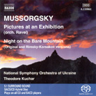 Pictures at an Exhibition, in the orchestration by French composer Maurice Ravel, is about tied with Holsts The Planets as the work most recorded on multichannel SACD and DVD-Audio discs. And why not, considering its broad tonal palette, which contains every orchestral color imaginable? Though Mussorgsky was a crazed alcoholic, he was also a visionary, and his vivid imagery, coupled with Ravels spot-on knowledge of the orchestra, produced a winning composition that has been played countless times since its premiere. Theodore Kuchars broad, incisive reading earns its place among the top three or four. The disc contains some interesting fillers. Mussorgsky was so drunk and sick most of the time that he left many of his pieces incomplete. His original version of A Night on Bare Mountain is wild and woolly, with harmonies that must have seemed weird and futuristic in the 19th century. His compatriot Rimsky-Korsakov produced a harmonically cleansed version after Mussorgskys death, and both are included here. The National Symphony Orchestra of Ukraine plays with excellent tone and precision. If you need proof, check out the woodwinds in Tulleries, in Pictures. The exciting sound is large and reverberant yet quite detailed. So far, the best Naxos multichannel recordings have come from Russian sessions, and this release signals that the labels excellent standard shows no signs of falling. The Great Gate of Kiev in Pictures is of demo quality, with its resounding bass drum, pungent brass, and shimmering cymbal clashes. The Hopak from Sorochintsy Fair is likewise impressive.  ...Rad Bennett