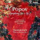 Again Leon Botstein champions an unjustly neglected composition, this time the first symphony of Gavriil Popov, a contemporary of Shostakovich. This bold, colorful work has striking themes and clever orchestration, and was admired by Shostakovich and praised by Prokofiev, yet was politically suppressed. Though composed in 1934, it received its first US performance only recently, with Botstein conducting the American Symphony. The CD is filled out with a student work by Shostakovich that at times might be mistaken for a recently discovered work by Tchaikovsky. The Theme and Variations, Op.3, is not very significant but is thoroughly enjoyable. The London Symphony plays with splendid precision and tone, and the Telarc multichannel SACD conveys its sound with often startling intimacy and realism. The dynamic range is wide and the frequency range solid, from the lowest bass note to the highest violin passage. The Popov is a real discovery presented in the best possible light.