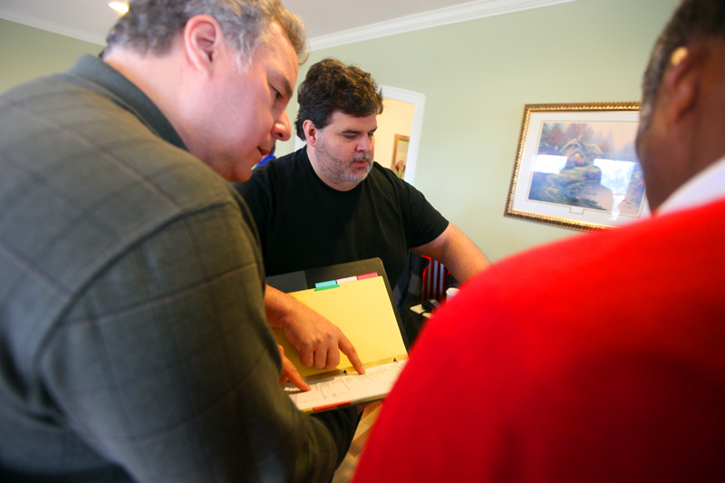 of his product that he didnt seem to realize was a flaw at all.  Albert Bellg (left) meets with Mike Latvis (center) of