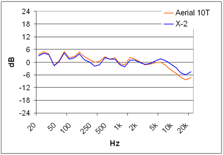 From the impulse response, Terry determined the 1/3-octave frequency response of the system. We adjusted the speaker positions forward and back in equal increments, but the best locations turned out to be close to where originally determined by the listening tests and Wilson Audios recommendations: 28" from the front wall, 64" from each sidewall, 11 6" apart, and 13 from the listener. The response graph is admirably flat to 10kHz, +/-3.4dB after treatment, but then falls off 6.9dB at 16kHz. Was that the X-2s? Sacre bleu! We swapped in a set of Aerial Acoustics 10Ts to cross-reference; they, too, showed the drop off at 16kHz.
