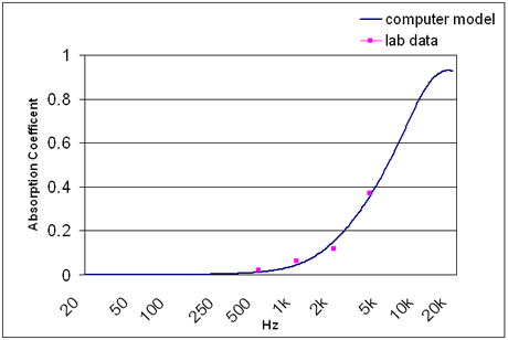 Terry surmised that the dip in the response at the highest frequencies (16kHz) was due to overabsorption. It turned out that both the frequency-response and reverberation-time curves drop off at the highest frequencies, indicating a direct correlation. The question remained: What in the room was still a constant source of very-high-frequency absorption, both before and after room treatment? The really thin Berber carpeting! "Thin, porous materials, like carpet, absorb primarily at high frequencies," according to Terry. "Generally, the higher the frequency, the more they absorb. And there is a whole lot of carpet surface area in the Music Vault. "But we dont have hard acoustical data on very-high-frequency absorption of construction materials. The highest frequency measured in the lab is usually only 4kHz. So I built a computer model of 0.25"-thick pile carpeting, using a fairly low pile density that approximates that of the room. I used equations developed by Allard and Johnson in 1993, adjusting the parameters so as to obtain a good fit with existing lab data. "The absorption coefficient (0 means no absorption, and 1 is complete absorption) takes off at very high frequencies. According to my model, it reaches a high of 0.93 at about 16kHz. This agrees very nicely with both the frequency-response and reverberation-time measurements."