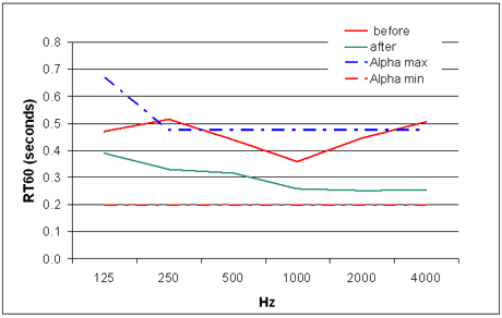 Presented next are the Music Vaults reverberation times. Terry states that the optimum RT60 for a room the size of the Music Vault is between 0.20 and 0.48 second. The Music Vault averaged 0.30 second after acoustical treatment. Terry explains: "Reverberation time naturally goes up with room size, because it takes longer for sound to decay in larger rooms. There are fewer wall reflections over the same time period in a large room compared to a small room. Amazingly, our brains appear to compensate for this, so the room reverberation sounds normal for the room size. And yet this sophisticated mechanism still preserves a perception of the relative liveness or deadness of a space. A 1-second reverberation time for a very large concert hall would likely make that room sound too dead. But the same 1-second reverberation time in a much smaller space, such as a home listening room, would sound too live." The optimal RT60 can even vary with the type of music played; modern, fast-paced, complex music needs somewhat lower RT60 times. Listening tests confirmed that Terrys assessment was correct, however: "My listening tests of old-warhorse Bach and Beethoven showed the rooms reverb wasnt too low. The tracks I played sounded simply amazing."