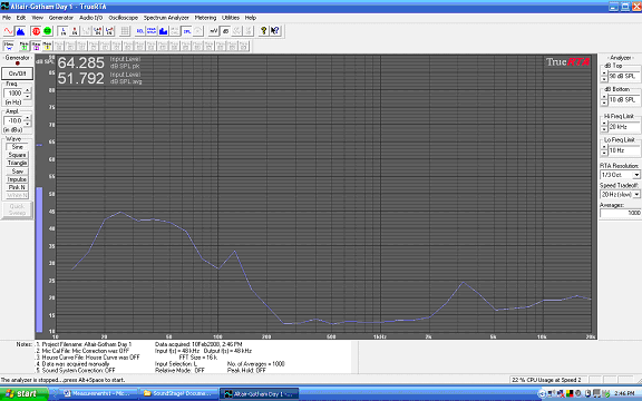 Once I had the Altairs set up and playing music beautifully in their nearfield positions, it was time to move on to the Gotham g213s. This is where proper subwoofer positioning in relation to the mains is paramount. To achieve the correct phase relationship in each Altair-Gotham pair, I placed the Gotham just to the outside of and slightly behind the Altair. Each Altair has a 15" side-firing woofer (in my case, on the speakers inward-facing sides) that operates below 80Hz -- essentially, its own built-in subwoofer. This was the driver that each Gotham would primarily interact with. I used a tape measure to ensure that the Gothams and Altairs woofers were all equidistant from my listening positioning. My goal was to have the speakers and subwoofers outputs sum acoustically, with the result of minimal phase cancellation. Remember, if the Altairs and Gothams drivers were firing out of phase, they would acoustically cancel each other out at the frequencies where the drivers outputs overlap. This cancellation would show up as a trough on the TrueRTA graph. No phase cancellation, and hence no trough, would indicate that the subs and speakers were summing properly. A flat frequency response could then be dialed in simply by adjusting the output levels of the subs and speakers relative to each other. A few words about crossovers I experimented with several Altair-to-Gotham crossover settings, adjusting both crossover frequency and slope. I used an outboard electronic crossover to send a high-pass signal to my main speakers while sending a low-pass signal to the subs (in which case I bypassed the Gothams built-in crossovers altogether). In the process, I tried many different crossover frequencies, and ultimately got very good sound and in-room measured response with the crossover set in the 40-60Hz range with a 24dB/octave slope. Im quite confident that, with speakers smaller than the Rockport Altairs, you could use a higher crossover setting -- the Gothams operated fairly linearly to over 100Hz in my room. In the end, however, I acoustically rolled off my main speakers by changing their positions in the room. This meant that I didnt have to insert another electronic component -- the outboard electronic crossover -- into the primary signal path. I suppose this is partially an old audiophile superstition, but experience has taught me that adding any component to the signal path will alter the sound to some degree. I recommend you try it both ways -- with and without an electronic high-pass crossover -- and determine for yourself which configuration works best. And if your main speakers lack the Altairs dynamic-range capabilities, remember that relieving them of deep-bass duties by crossing them over to a sub(s) will increase their headroom and lower their levels of distortion.